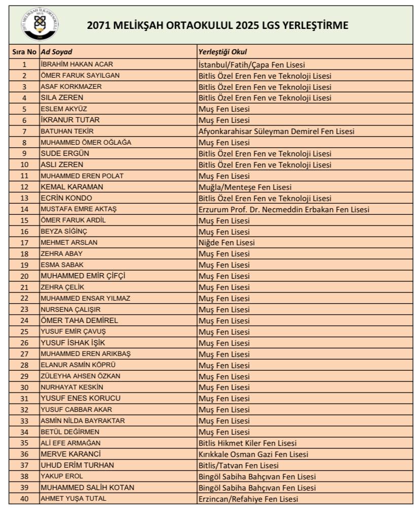 Muş’ta eğitim alanında örneğine az rastlanır bir başarıya imza atan 2071 Melikşah Ortaokulu, 2025 Liselere Geçiş Sınavı’nda (LGS) gösterdiği performansla adından söz ettirdi. Okul, bu yıl tam 40 öğrencisini Türkiye’nin prestijli Fen Liselerine yerleştirerek Muş genelinde LGS birincisi oldu.