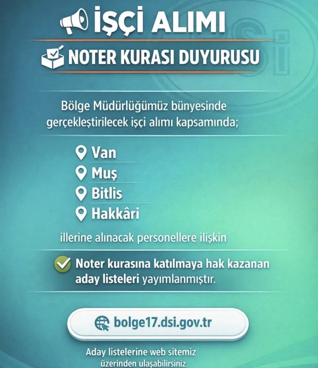 Bölge Müdürlüğü bünyesinde yapılacak işçi alımı kapsamında özellikle Muş’ta istihdam edilecek personeller için süreç resmen başladı. Van merkezli Bölge Müdürlüğü sorumluluk alanında yer alan Muş, Van, Bitlis ve Hakkâri illerine alınacak personellere ilişkin noter kurası duyurusu kamuoyuyla paylaşıldı.