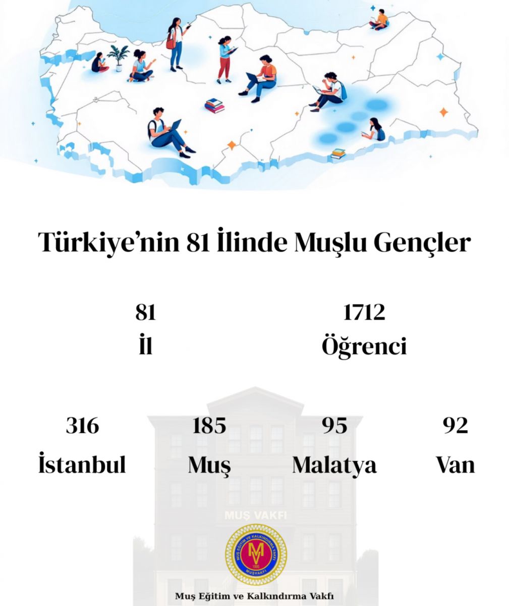 Vakıf yalnızca Muş’ta değil, Türkiye genelinde 81 ilde öğrenim gören Muşlu öğrencilere burs imkânı sundu. En fazla bursiyerin bulunduğu ilk 5 il; İstanbul (316), Muş (185), Malatya (95), Van (92) ve Ankara (86) oldu. Bunun yanı sıra İzmir, Diyarbakır, Erzurum, Elazığ, Eskişehir ve Kocaeli gibi illerde de çok sayıda öğrenci vakfın desteğinden faydalandı.
