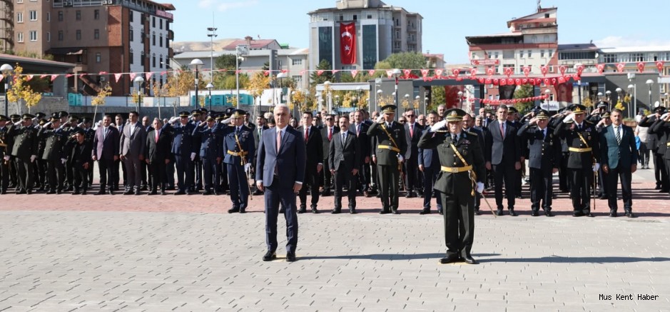 Kent Meydanı’nda gerçekleştirilen törende, Muş Valisi Avni Çakır ve Garnizon Komutanı Kurmay Hava Pilot Albay Mehmet Emin Okutkan, Atatürk büsütüne çelenk sundu. Saygı duruşunda bulunulmasının ardından İstiklal Marşı okunduğu törene, Cumhuriyet Başsavcısı Hüseyin Kantar, Vali Yardımcıları Mustafa Batuhan Alpboğa ve Cihat Abukan, kamu kurum amirleri, öğretmenler ve öğrenciler katıldı. Kutlama programı, 29 Ekim Cumhuriyet Bayramı kapsamında il genelinde düzenlenecek çeşitli etkinliklerle devam edecek.