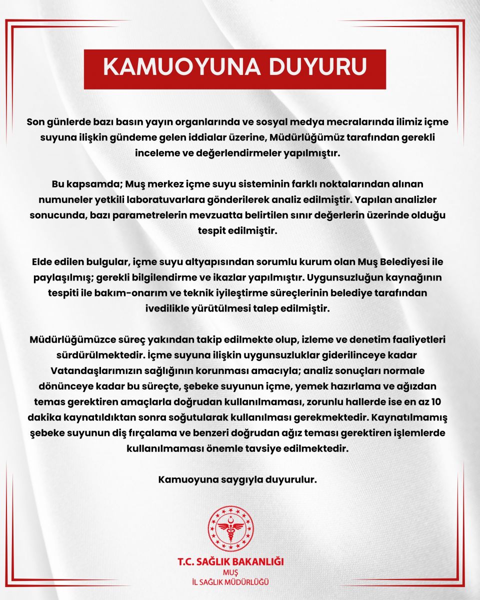 Elde edilen bulguların, içme suyu altyapısından sorumlu kurum olan Muş Belediyesi ile paylaşıldığı aktarılan açıklamada, gerekli bilgilendirme ve ikazların yapıldığı, uygunsuzluğun kaynağının tespiti ile bakım-onarım ve teknik iyileştirme süreçlerinin belediye tarafından ivedilikle yürütülmesinin talep edildiği kaydedildi.