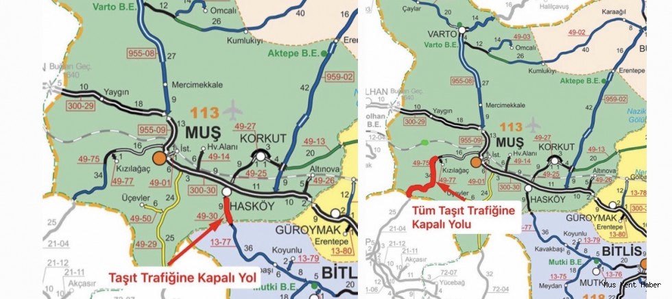 Öte yandan, 49-30 KK nolu Hasköy–Mutki il yolunun 0+000 ile 9+000 kilometreleri arası da olumsuz hava koşulları sebebiyle saat 13.35 itibarıyla taşıt trafiğine kapatıldı.