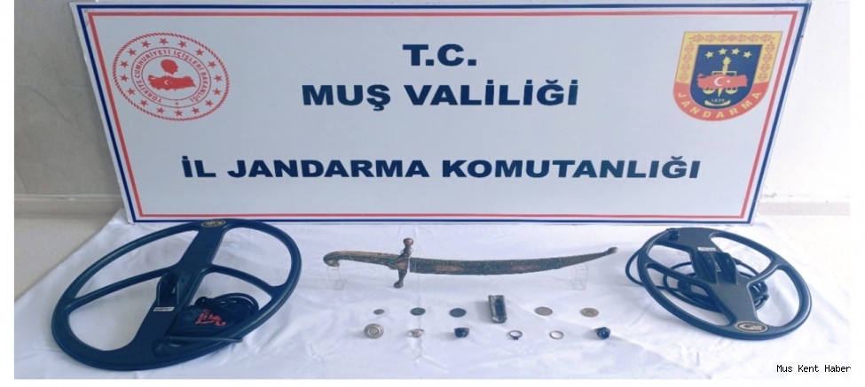Elde edilen bilgiler doğrultusunda Muş Sulh Ceza Hakimliğinden alınan arama kararına istinaden şüphelinin ikametinde arama yapıldı. Yapılan aramada, Müze Müdürlüğü tarafından Osmanlı dönemine ait olduğu değerlendirilen 1 adet hançer/kama, 5 adet sikke, 6 adet yüzük, 1 adet taş obje ile birlikte 2 adet metal dedektör başlığı ele geçirilerek muhafaza altına alındı.