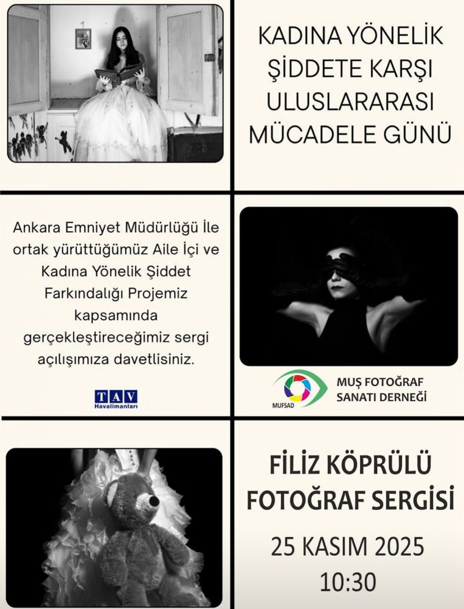 Muş Fotoğraf Sanatı Derneği (MUFSAD), sosyal farkındalık çalışmalarına da devam ediyor. Geçtiğimiz hafta, Ankara Esenboğa Havalimanı’nda Kadına Yönelik Şiddete Karşı Uluslararası Mücadele Günü kapsamında özel bir sergi açıldı. Ankara Emniyet Müdürlüğü ve TAV Genel Müdürlüğü iş birliğiyle düzenlenen etkinlikte, dernek yönetim kurulu üyesi Filiz Köprülü’nün uluslararası kadın temalı sergisi ziyaretçilerle buluştu.