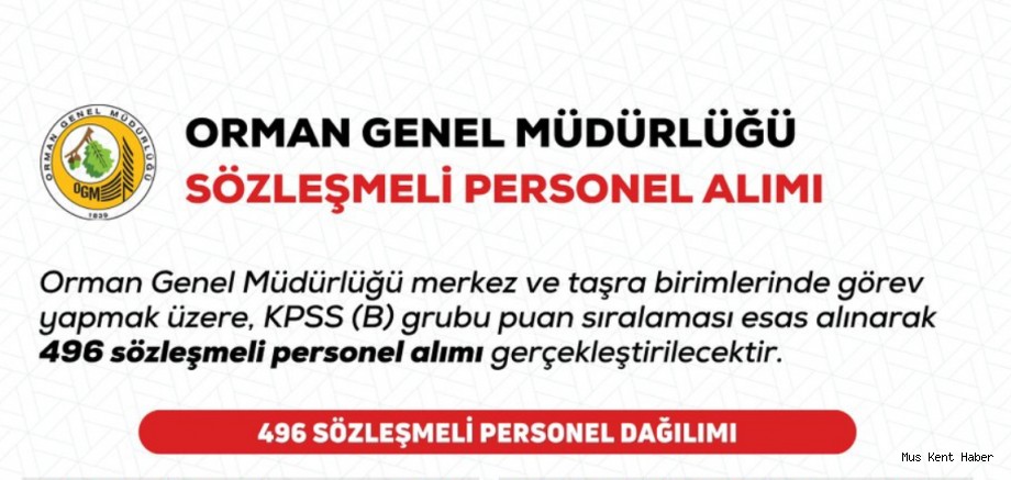 Buna göre, Genel Müdürlüğün merkez ve taşra birimlerinde istihdam edilmek üzere lisans mezunu 20 mühendis, 30 büro personeli, 4 avukat, 2 biyolog ve 1 diyetisyen, ön lisans mezunu 1 laborant ve 2 tekniker, ortaöğretim mezunu 1 koruma ve güvenlik görevlisi, 296 şoför-operatör, 2 garson, 2 bulaşıkçı ile 135 temizlik, servis, evrak, arşiv ve bakım işleri görevlisi olmak üzere 496 personel alınacak.