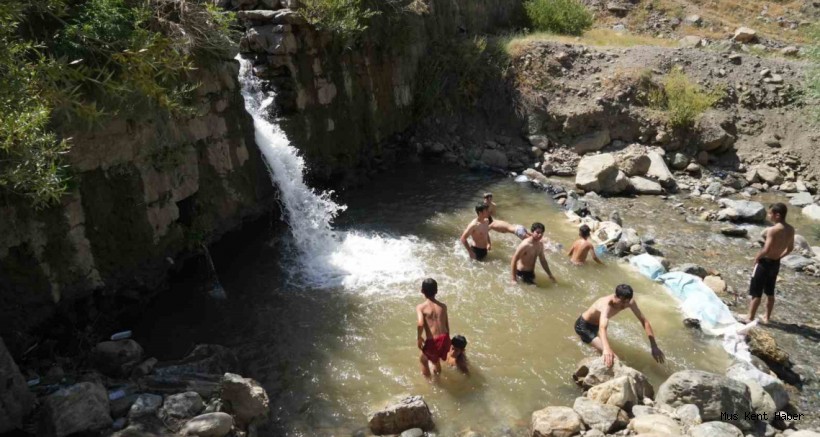 Evlerinden getirdikleri brandalar ve dereden topladıkları taşlarla küçük bir havuz oluşturan çocuklar, günün büyük bir bölümünü burada geçiriyor. Suyun serinliği sayesinde sıcak havanın etkisinden korunan çocuklar, Muş’ta deniz olmadığı için bu yöntemi tercih ettiklerini ifade ediyor.